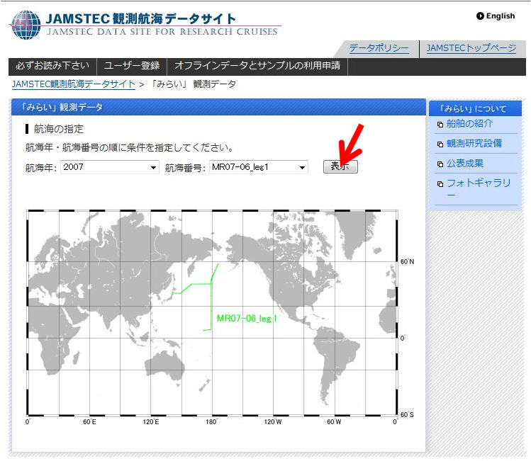 ここで、利用したいデータを選択します。ここでは、例として航海年として2007年、航海番号としてMR07-06 Leg1を選択します。選択すると、次のような航跡図が表示されます。