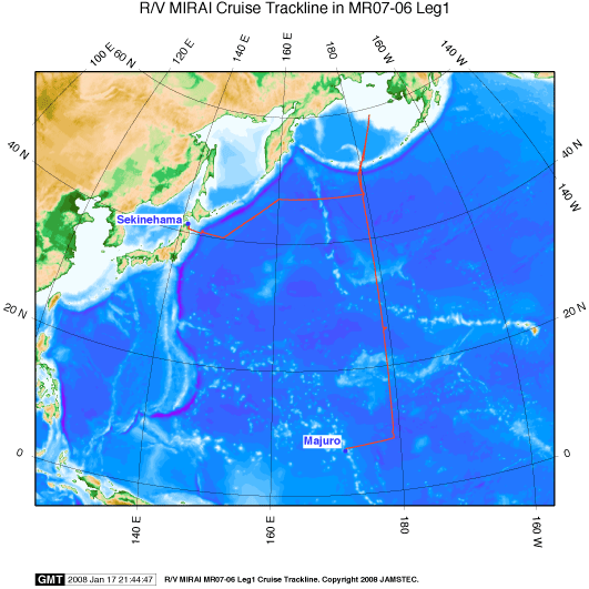 データは,海洋観測船「みらい」の調査航海のCTDデータベースから作成したものです。航跡図を以下に示します。