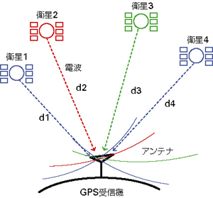 陸上や海上で自分がいまどこにいるかを調べる方法として、現在ではGPSが最も普及しています。これは、地球の周りを回るたくさんの人工衛星(どこを飛んでいるか分かっています)から送信される(送信した時間も知らせます)電波の伝わる時間を正確に計り、それに電波の速度をかけて4個の衛星までの距離(d1〜d4)を出し、それをもとに地球上(球面上)での位置をわずか数メートルの誤差で計算します。