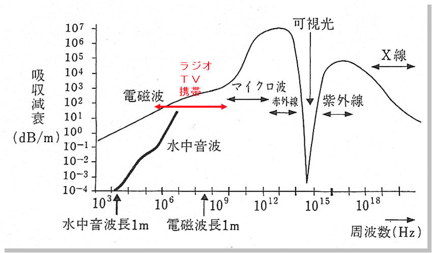 図9 電波と海中音波の違い(通信に関する事項) ------あまりに不利な音波の性質-----