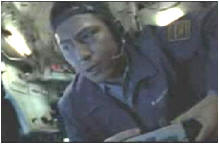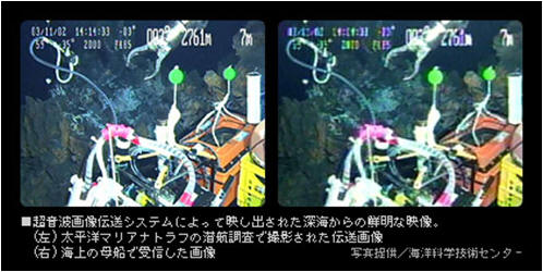 潜水調査船「しんかい6500」が運航をはじめてからすぐに、電話のような音声通信方式だけでは海底の潜水船の作業状態を伝えるのは困難であることがわかりました。そこで、画像情報を送ることができる画期的な装置がJAMSTECによって開発されました。この装置は、最新の画像処理技術や信号処理技術が応用され、情報伝送方法としては、携帯電話と同じように、すべて1と0のデジタル信号に変換されています。しかし、周波数範囲は16kHz〜24kHzのわずか8kHzで、いいかえるとスピーカーとマイクを使って画像を送っているようなものです。やがて画像を高速で伝送する技術の研究が進み、「しんかい6500」に積まれている装置では、船外TVカメラでとられた家庭用のビデオくらいのカラー画像(図10)を、8秒に1枚ずつ連続して母船に送ることができるようになり、船上の研究者とスムースに連携して調査ができるようになりました。