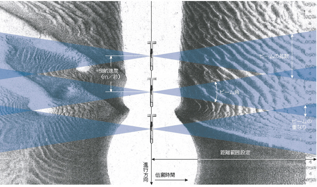 図1のように、トランスデューサアレー(注1)を曳航体にのせて海上の船からワイヤーで吊し、横方向に音波ビーム(ファンビーム)がでるように、海中をできるだけ一定方向に一定の水深で曳航します。曳航中は、トランスデューサから規則正しい間隔で音響パルスが発信され、海底の凹凸にぶつかって戻ってくる受信信号の時間遅れから距離を計算し、信号の強さを記録します。この反射信号の受信は、次のパルスが送信されるまで続けられ、次のパルスが送信されると、またこのサイクルが始まります。1回のパルスによって海底から戻ってくる反射信号は、1本の線として記録器に表示され、この線の暗い部分と明るい部分が、時間に対応した反響の強弱を表します。何百本もの線でできているテレビ画面と同様に、1本の線だけを見たのでは意味のある情報は得られませんが、このプロセスを毎分数十回も繰り返すと、次第にディスプレーに並んでくる線は面となって、意味のある画像を形成することになります。このように作られる画像をソノグラム(音響画像)といいます。図1から分かるように、音響ビームを狭くするほど進行方向の細かいところまで区別できるようになります。