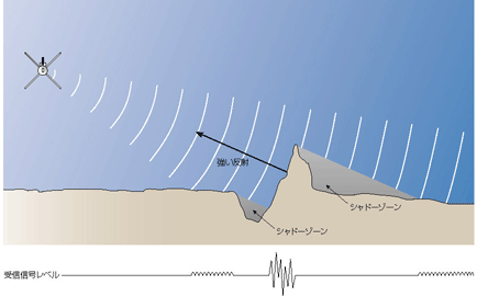 図3のように、海底の突起物にパルスが当たるとその後方には音波が到達しないため、音波の影(シャドーゾーン)ができ、この影の長さから、突起物の高さや大きさを推測することができます。理論的(スネルの法則)には、平らな鏡面に斜めに当たった波のエネルギーの大半は、反対側に行ってしまうため受信ができませんが、現実の海底は鏡のようなものではなく、泥や砂の粒で構成されており、細かな凸凹があります。したがって、それらに当たった音波は、相当弱くはなるものの必ず戻ってくるため受信できるのです。しかし、図1のように、中心付近は送信パルスが真上付近から当たるため、信号は強いのですが、音波の影ができにくく空白になってしまいます。